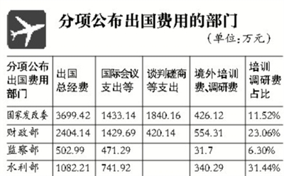今年,针对“三公”经费中的出国经费决算,国家发改委、财政部、监察部、商务部、水利部等首次分类公布详细数额。出国经费从名目上主要分为国际会议、磋商谈判、境外培训、调研费几大类。其中,出国经费公布程度较高的几个部门,首次单列出了这几个名目的花费。