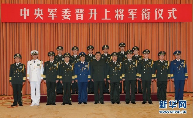 7月31日,中央军委在北京八一大楼隆重举行晋升上将军衔仪式。中央军委主席习近平向晋升上将军衔的同志颁发命令状。这次晋升上将军衔的6位高级军官是:总政治部副主任吴昌德、总装备部政治委员王洪尧、军事科学院政治委员孙思敬、北京军区政治委员刘福连、南京军区司令员蔡英挺、广州军区司令员徐粉林。这是仪式结束后,习近平等领导同志与晋升上将军衔的军官合影留念。 新华社记者李刚摄