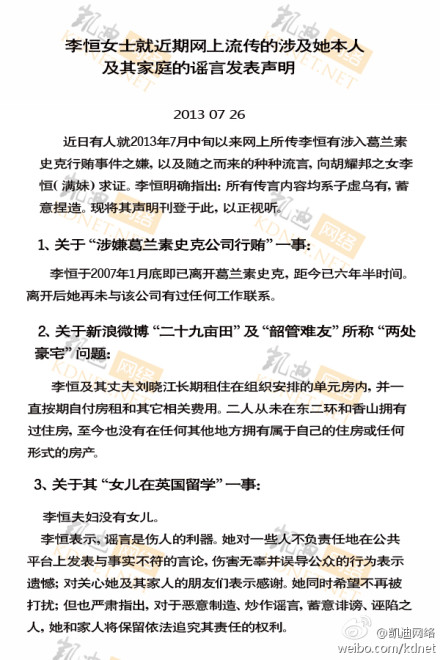 新京报讯 (记者周清树)针对近期网上有关胡耀邦之女李恒(满妹)涉及葛兰素史克行贿事件的传言,李恒近日发表声明进行回应,否认涉及葛兰素史克案,否认拥有豪宅等。