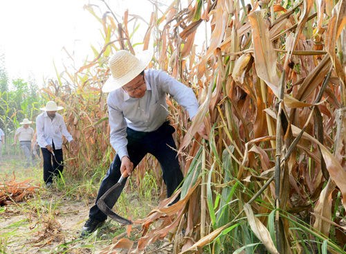 8月6日,张春贤在江格勒斯乡代尔瓦扎库木村农民麦苏木·亚生的玉米地里,一边参加割玉米劳动,一边了解乡亲们的生产情况。(李杨摄)