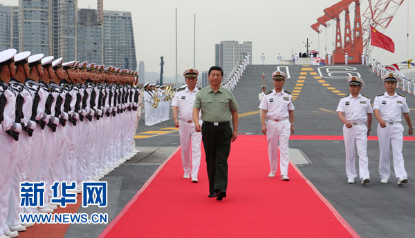 当天下午,习近平又风雨兼程赶往大连,登上停泊在大连港的辽宁舰。军旗迎风飘扬,水兵整齐列队,辽宁舰迎来了一个庄严光荣的时刻。习近平检阅了水兵仪仗队,随后攀舷梯、下机库,深入舱室战位,察看舰上装备设施,询问技战术性能,了解官兵工作训练情况。习近平十分关心舰上官兵后勤保障情况,住宿、饮食、看病等,他问得很详细。习近平接受了水兵们精心准备的舰徽、舰帽,郑重在航泊日志上签名。离别时,习近平登上舷梯,向水兵们深情挥手,他叮嘱辽宁舰舰长和政委,你们要牢记职责,不辱使命,早日形成战斗力和保障力,为建设强大的人民海军作贡献。