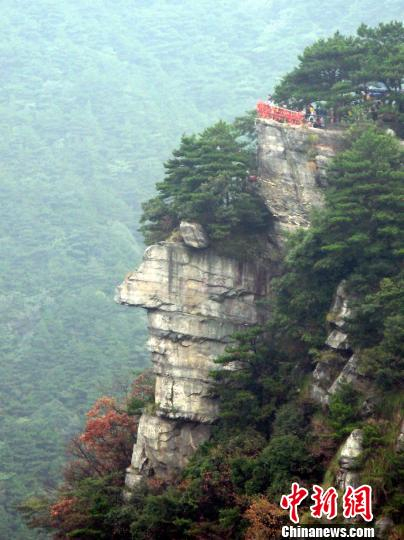 8月31日,在江西庐山风景区锦绣谷至仙人洞的途中,游客可以看到一处酷似人物头像的危崖峭壁,眉眼口鼻下巴等五官轮廓清晰,尖尖的鼻子正是镌刻锦绣谷三个大字的巨石。据导游讲,当地人把这块像巨人鼻子的石头称为“猪头石”;头顶上的松树恰似头发,红色售货亭像一顶小红帽;头部以下的悬崖峭壁像巨人的身躯,正在注视遥望着远处的山谷和山下的九江县城。
