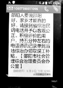 短信是邵阳市社会管理综合治理委员会办公室发来的,短信称,请接到省里民意调查电话,同时给出了客观公正、积极评价的市民,凭通话记录可以领取误工补贴。