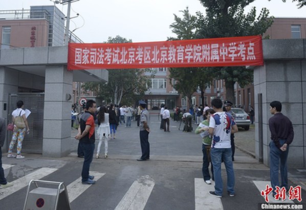 9月14日,2013年国家司法考试开考,图为一些考生在北京市一处考点前准备入场。今年是司法考试制度实施以来报名人数最多的一年,共有43.6万人报名参加司法考试,全国共设置258个考区。中新社发 侯宇 摄