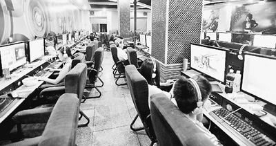 图为天津市河西区卫星里居民区里某网吧。很多青少年在上网,他们有的在打游戏,有的在看电影,身边的桌子上放着方便面、饮料、香烟等。李世琦摄