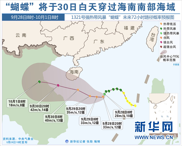 图表:“蝴蝶”将于30日白天穿过海南南部海域 新华社记者 张勋 编制