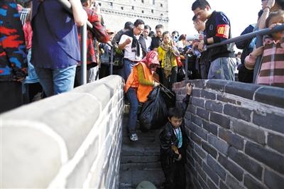10月6日,黄金周第六天,北京八达岭长城景区累计游客人数达35.66万人,产生垃圾共计109吨。(新京报记者 周岗峰 摄影报道)