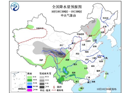 18日08时至19日08时,青海中南部、西藏中东部、内蒙古中部和东南部等地有小到中雨(雪)或雨夹雪,其中,青海东南部的部分地区有大雪;辽宁西部、华北北部、西南地区大部、湖北西南部、湖南大部、华南西部、台湾等地有小到中雨,其中,四川南部、云南东北部等地局部地区有大雨。西北地区东北部、内蒙古中东部等地有4-5级偏北风;台湾海峡将有6~8级、阵风9级的东北风。