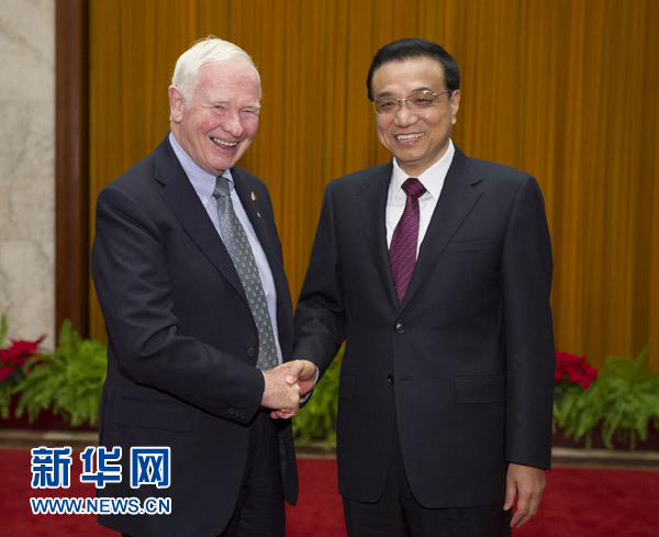 10月18日,国务院总理李克强在北京人民大会堂会见加拿大总督约翰斯顿。 新华社记者黄敬文摄