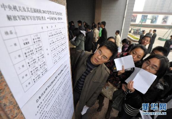 资料图片:图为2011年11月27日,在南京林业大学考点,参加2012年国家公务员考试的考生在考场分布图表上查找自己的考场。新华社发