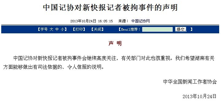 人民网北京10月24日电 (记者孝金波)今天中国记协在其官网“中国记协网”头条位置发布声明,称会继续高度关注“新快报记者被拘事件”,希望湖南有关方面能够做出有司法依据的、令人信服的说明。