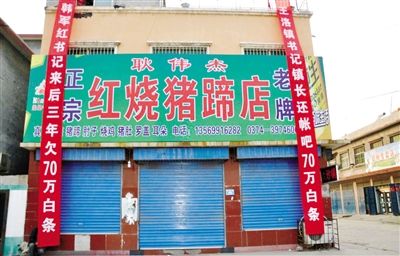 10月24日,河南许昌襄城县王洛镇,猪蹄店老板在店外挂条幅向镇党委书记讨账。