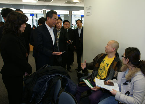 王毅与签证申请服务中心以及使馆领事部的工作人员进行了交谈,关心他们的工作和生活情况,鼓励他们不断增强服务意识,提高业务水平,为促进中法两国人民的交往,增进中法传统友好作出更大贡献。王毅还同前来办理签证的华人华侨互动,认真听取他们对于改进领事及签证服务的意见。