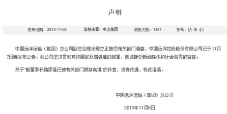 中远系昨日发布两个重磅公告:中远集团在其官网发表声明,“关于‘前董事长魏家福已被有关部门限制离境’的传言,没有依据,特此澄清”。