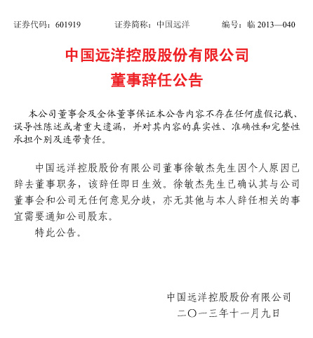 *ST远洋则公告称,公司董事徐敏杰因个人原因辞去董事职务,该辞任即日生效。公告还表示,徐敏杰11月7日已证实被有关部门调查,其已确认与公司董事会和公司无任何意见分歧,亦无其他与辞任相关的事宜需要通知公司股东。