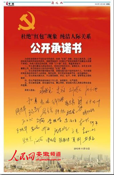 人民网安徽频道记者看到,该份公开承诺书刊登在11月14日出版的《拂晓报》4版,占据了一个整版。承诺书共承诺5项,大致内容是市领导带头遵守廉洁从政各项规定,坚决反对“四风”,自觉抵制公务活动收送“红包”现象,拒收管理对象和服务对象、管辖范围内的下属单位和个人、与行使职权有关系的现金、有价证券、支付凭证和各种礼节,不得以各种嫁娶、乔迁等名义借机敛财等等。