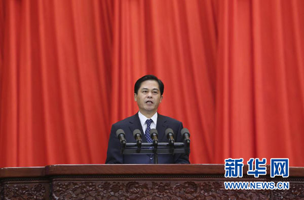 中华全国总工会副主席、书记处第一书记陈豪代表各人民团体向大会致贺词。新华社记者 丁林摄