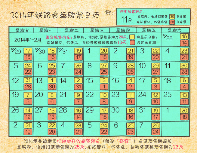 答:从总体上讲,2014年铁路春运火车票的预售期与日常火车票的预售期相同。其中,图定旅客列车互联网、电话订票预售期为20天,即2013年12月28日发售2014年1月16日(春运第一天)车票;车站窗口、代售点、自动售票机预售期为18天,即2013年12月30日发售2014年1月16日车票。