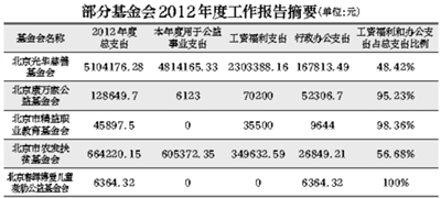 日前,市民政局在媒体上公布了《北京市基金会2012年度工作报告摘要》,对209家基金会2012年度工作报告中的公益支出、财务会计、财务审计结论、监事意见等情况进行公示。北京青年报记者统计发现,18家基金会的工作人员工资福利和行政办公支出占总支出的比例超过了10%,部分基金会甚至超标严重,不符合《基金会管理条例》比例不得超过10%的规定。
