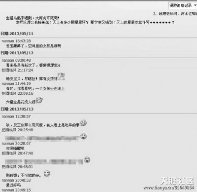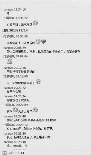 5月13日的聊天记录中,“把酒临风”对“nannan”说,“我们互相关心着,温暖着,彼此增长着正能量,感觉身子也是连在一起的”。9月1日的聊天记录显示,“把酒临风”称自己要在党校学习一段时间,11月初结束。同时,“把酒临风”还表示过教室屏蔽信号,无法及时与对方联系。