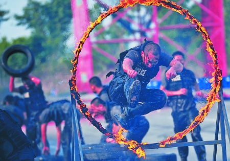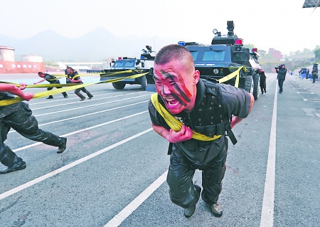 在极限体能科目中,特警队员快速穿越低桩网、火圈障碍;进行了激烈的水上格斗;6人一组高举600斤重的圆木奔跑,并在体能极度透支的情况下,用牵引绳拉动近20吨的装甲车。
