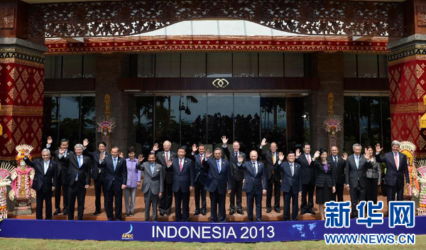 10月8日,在印度尼西亚巴厘岛举行的亚太经合组织第二十一次领导人非正式会议开始前,国家主席习近平和与会领导人集体合影。新华社记者马占成摄