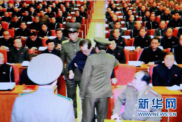 这张翻拍自朝鲜中央电视台的电视画面显示,张成泽在12月8日劳动党中央政治局扩大会议现场被带走。 新华社记者张利摄