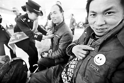 昨天上午,北京铁警联合心理专家在北京西站展开现场咨询,为旅客和工作人员减压,消除负面情绪,并现场发放了数百个黄色笑脸标志,让乘客带着“笑脸”上火车。摄影/记者 汪震龙