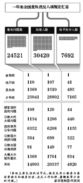 自2012年12月4日八项规定实施到2013年底,全国共有30420名领导干部,因违反八项规定被处理,其中被处以党纪政纪处分的领导干部达7692名。昨日,中纪委监察部官网通报了全国查处违反八项规定精神问题情况。