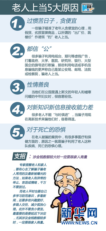 核心提示:2013年老年人被骗的消息屡屡传出,“广州一位六旬阿婆通过微信摇一摇认识陈某并约其见面。聊天中陈某称事主孩子可能有血光之灾,可帮其做法事解除,阿婆将身上仅有的10余万元拿给男子,做法事后两男子不知所终。”被骗老人讲述的亲身经历,又再一次引起了我们的警惕。当下正值春节、元宵节的来临之际,沉浸于开心喜悦中的老年人总是在不经意间被人利用、上当受骗。那么该如何提高老年人的防范意识、如何整治社会上欺诈老年人的行为、如何提升儿女的责任感给老年人足够的温暖和保护就成为了当下值得深议的重要话题。