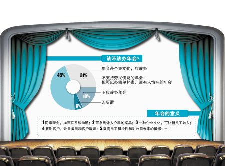 据新华社报道,前不久,一家咨询机构在网上发起了一项“年会意愿调查”。结果显示,45%的网友认为“年会是企业文化,应该办”;31%的网友选择“不支持劳民伤财的年会,但可以办简单朴素、富有人情味的年会”;18%的网友选择“就不应该办”;其余选择“无所谓”。也就是说,76%的受访网友不愿年会消失。