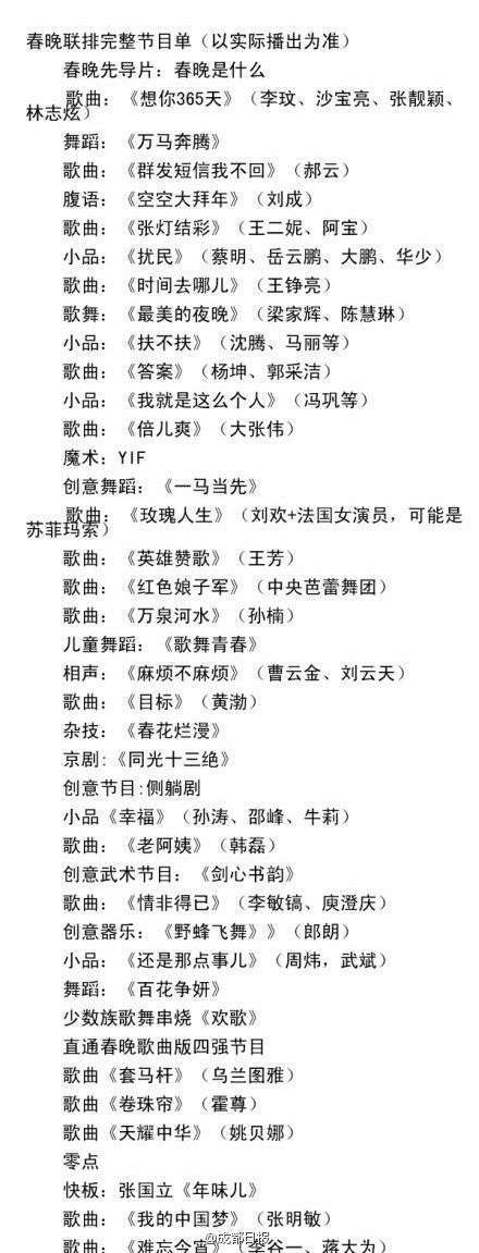 1月20日,据成都日报微博消息,《2014春晚联排节目单》新鲜出炉!央视马年春晚18日进行了首次带机联排,杨坤、郝云、王铮亮、开心麻花等悉数亮相联排现场。而首次联排的完整节目单也就此出炉。随着之后联排的微调,春晚官方节目单也将随之出炉。