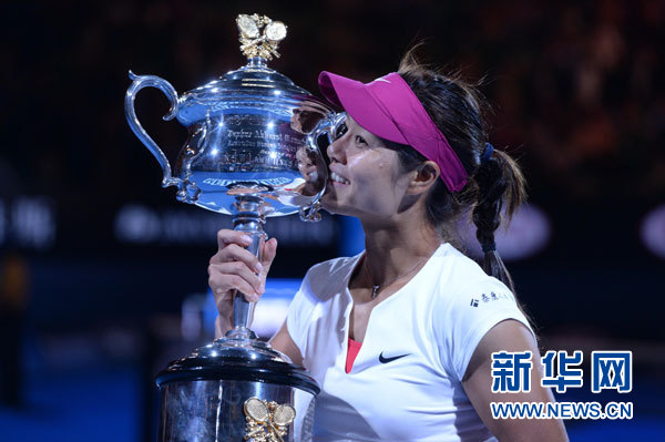 1月25日,中国选手李娜在颁奖仪式上。当日,在墨尔本举行的2014年澳大利亚网球公开赛女单决赛中,中国选手李娜以2比0战胜斯洛伐克选手齐布尔科娃,夺得冠军。新华社记者李俊东摄