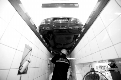 昨天,在北汽修理公司大屯检测场,检验员检查车辆底盘。京华时报记者王海欣摄