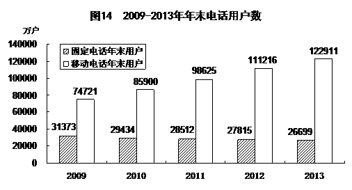 全年完成邮电业务总量16679亿元,比上年增长11.1%。其中,邮政业务总量2725亿元,增长33.8%;电信业务总量13954亿元,增长7.5%。邮政业全年完成邮政函件业务63.20亿件,包裹业务0.69亿件,快递业务量91.9亿件;快递业务收入1442亿元。电信业全年局用交换机容量减少2697万门,总容量41052万门;新增移动电话交换机容量[20]12522万户,达到196545万户。年末固定电话用户26699万户。新增移动电话用户11696万户,年末达到122911万户,其中3G移动电话用户40161万户。电话普及率达到110.5部/百人。互联网上网人数6.18亿人,其中手机上网人数5.0亿人。互联网普及率达到45.8%。