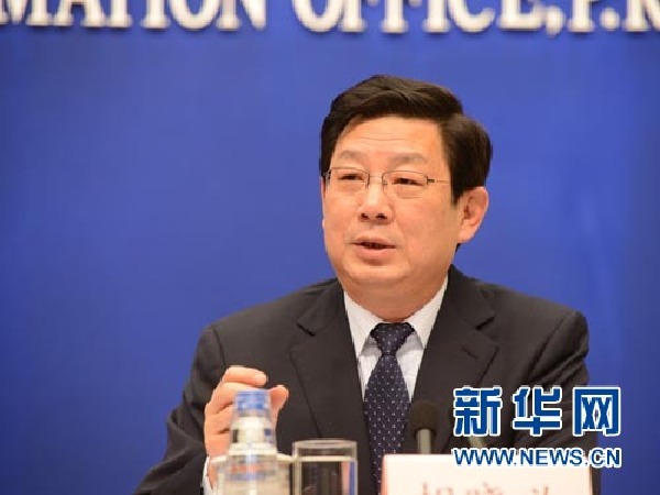 2014年2月26日,国务院新闻办举行新闻发布会,请人力资源社会保障部副部长胡晓义介绍建立统一的城乡居民基本养老保险制度等方面情况,并答记者问。 图为胡晓义介绍相关情况。新华网 郭小天 摄