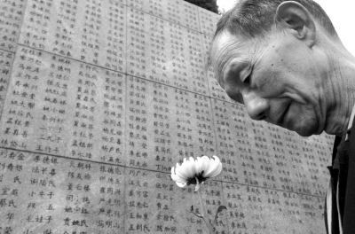 2006年4月5日,74岁的南京大屠杀幸存者手捧鲜花,祭奠被日军杀害的母亲。