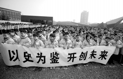 2008年12月13日,南京市小学生代表手持横幅参加悼念仪式。