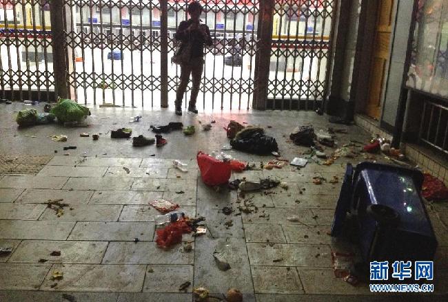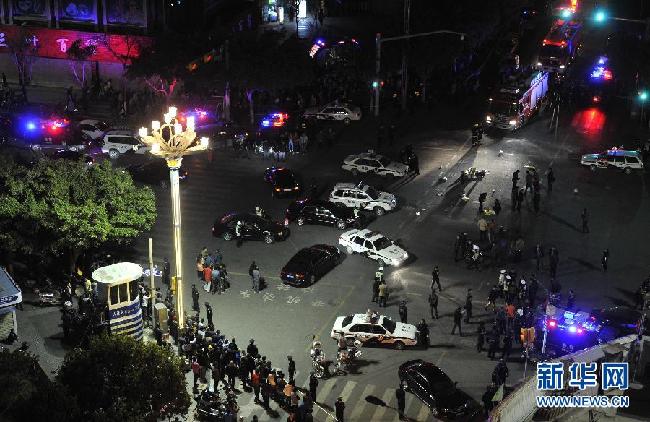 3月1日晚,警察在昆明火车站外拉起警戒线。3月1日晚9时20分,10余名统一着装的暴徒蒙面持刀在云南昆明火车站广场、售票厅等处砍杀无辜群众,截至3月2日1时,暴力案件已造成28名群众遇难、113名群众受伤。公安干警当场击毙5名暴徒,其余暴徒仍在围捕中。新华社记者蔺以光摄