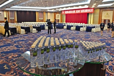 昨日,广东团驻地首都大酒店,会议室内摆放着矿泉水。据服务员介绍,每个座位摆放一瓶矿泉水,不够的自取,如果会议结束后瓶中水还有剩余,代表们会将其带走。 新京报记者 陈杰 摄