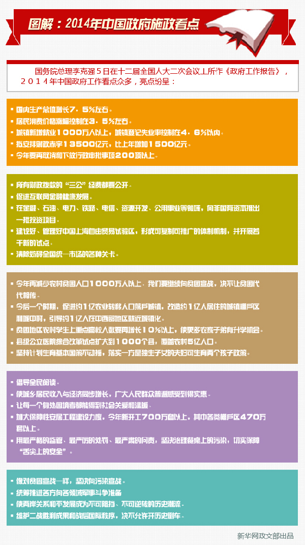 新华网北京3月5日电 根据国务院总理李克强5日在十二届全国人大二次会议上所作《政府工作报告》,2014年中国政府工作看点众多,亮点纷呈: