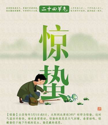 每年公历3月5日或6日为惊蛰,它的意思是天气回暖,春雷始鸣,惊醒蛰伏于地下冬眠的昆虫。此时节,气温和地温都逐渐升高,土壤开始解冻,我国大部分地区都已进入春耕季节。