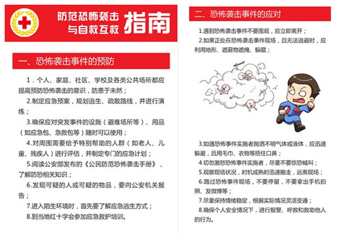 今日,中国红十字会总会对外发布《防范恐怖袭击与自救互救指南》。《指南》从恐怖袭击事件的预防、应对和现场急救三方面给予公众指导和建议。这是中国红十字会首次编印针对恐怖袭击事件的自救互救指南。
