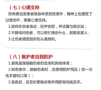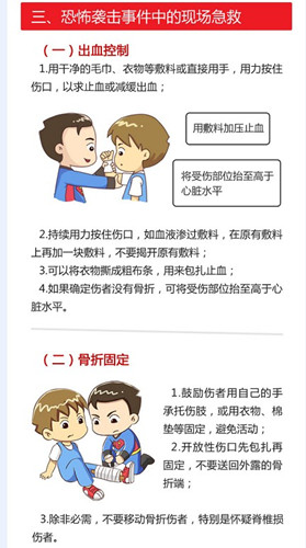 《指南》提示,人们应当提高预防恐怖袭击的意识,进入到陌生环境时,应首先了解应急逃生方式。恐怖事件发生时,路过现场的人不要停留,在确保个人安全的情况下进行报警、呼救和求助他人。《指南》还从出血控制、骨折固定、烧伤急救、休克急救、心肺复苏、特殊伤急救注意事项、心理支持和救护者自我防护等八个方面对恐怖事件现场急救知识进行了阐述。