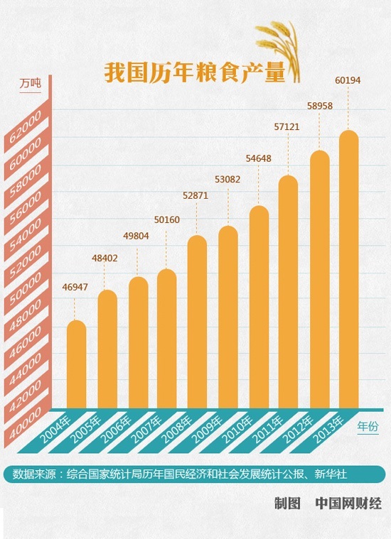 国家统计局日前发布公告称,2013年中国粮食总产量达到60193.5万吨,同比增长2.1%,中国粮食产量成功实现“十连增”。