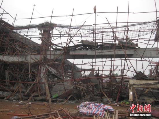 3月9日20时30分左右,广东湛江市遂溪县岭北镇广东北部湾农产品流通综合示范园区内一正在施工的建筑物坍塌,现场参与施工的32名工人中31人不同程度受伤,1人经抢救无效死亡。图为事故现场。中新社发 周益臻 摄