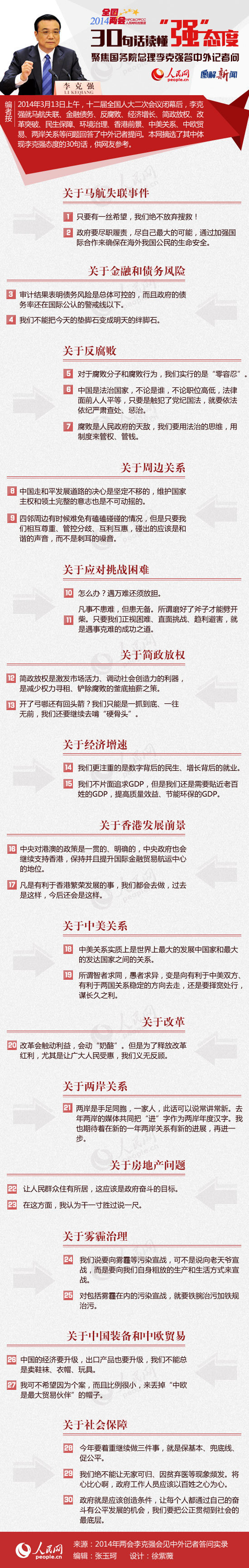 2014年3月13日上午,十二届全国人大二次会议闭幕后,李克强就马航失联、金融债务、反腐败、经济增长、简政放权、改革突破、民生保障、环境治理、香港前景、中美关系、中欧贸易、两岸关系等问题回答了中外记者提问。本网摘选了其中体现李克强态度的30句话,供网友参考。