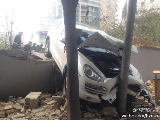 女司机误将油门当刹车 驾新买保时捷撞破围墙