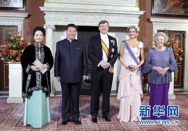 3月22日,国家主席习近平在阿姆斯特丹会见荷兰国王威廉-亚历山大。当晚,威廉-亚历山大国王在王宫为习近平举行盛大国宴。威廉-亚历山大国王、马克西玛王后、贝娅特丽克丝前女王共同迎接习近平和夫人彭丽媛到来。新华社记者鞠鹏摄