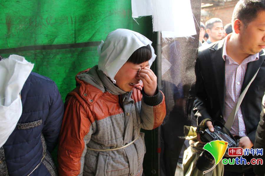 张伟同志的儿子张霄悲痛不已,不断拭去泪水。